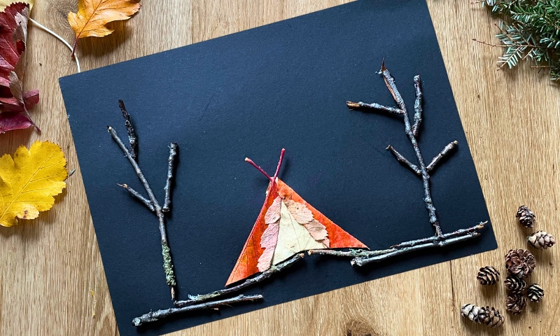 Schneide ein Blätterzelt aus und klebe es auf.Lege dann den Waldboden und die Baumstämme aus Ästchen und klebe sie fest.
