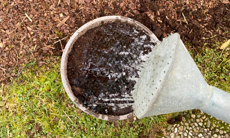 Gieße etwas Wasser darüber, sodass die Erde feucht, aber nicht nass ist.