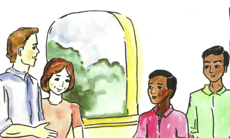 Samuela geht zur Kinderwoche und erzählt Raju, was er gehört hat: Christen glauben, dass Gott an einem wunderschönen Ort, dem Himmel, wohnt. Sie sagen, dass Gottes Sohn, Jesus, auf der Erde lebte und an einem Kreuz sterben musste - für die Sünden der Menschen.